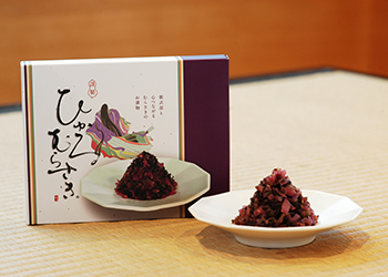 滋賀県産の希少な近江野菜「矢島かぶら」を主原料に、紫式部と大津・石山寺の雅を思わせる深い紫色で仕上げたしば漬風お漬物『ひかるむらさき』。保存料不使用・熱処理済でお土産にも安心。風味豊かでシャキッとした歯触りが、ご飯のお供はもちろん、おにぎりの具やまぜ込みにもぴったり。世代を問わず大津の風土とともに味わえる一品です。